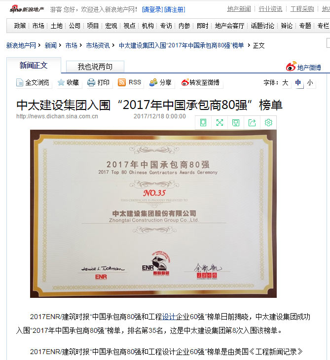 新浪網(wǎng)報道了“中太建設集團入圍“2017年中國承包商80強”榜單”