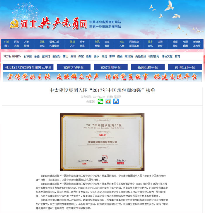 河北共產黨員網報道了“中太建設集團入圍“2017年中國承包商80強”榜單”