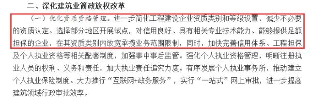 二、對具有市政公用和公路工程、水利水電和港口與航道工程其中一項資質的一級及以上總承包企業,能夠提供足額擔保且項目負責人具有相應業績的,可以在市政公用和公路工程之間、水利水電和港口與航道工程之間,互跨專業承接同等級業務