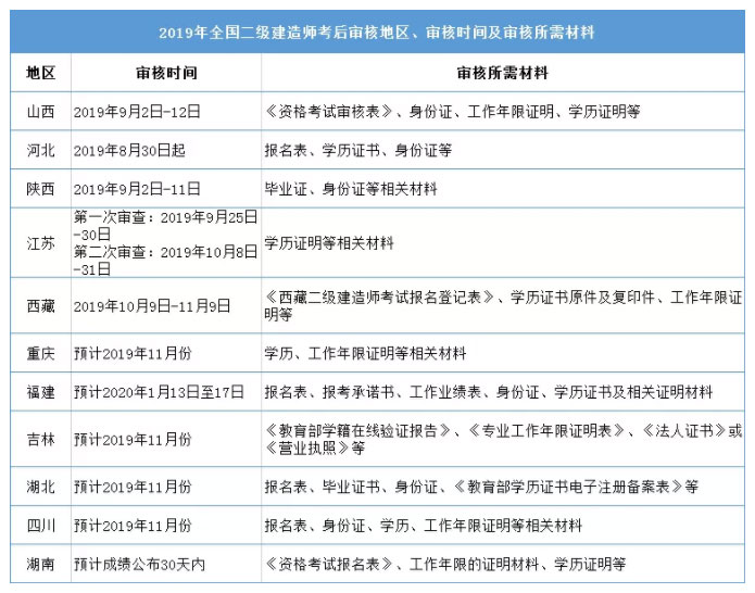 二建考試到現(xiàn)在已過了五月,大部分省市都已公布成績及合格標(biāo)準(zhǔn)。2019年有不少省市二建是有要求考后審核的。除了江西,其他地方怎么規(guī)定呢?以下是整理的二級(jí)建造師考后審核的地區(qū)及資料,供大家參考,希望對(duì)考生們有所幫助!(詳細(xì)信息以官方文件為主)