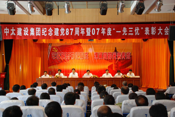 為了傳承黨的光榮傳統(tǒng),激勵士氣、鼓舞干勁,進一步動員全體黨員職工,以中共中央總書記、國家主席、中央軍委主席胡錦濤同志視察集團公司為動力,把當前抗震救災凝聚出來的力量和精神,運用到實際工作中,轉化為推動企業(yè)向前發(fā)展的強大動力,團結一致、攜手并進,為全面完成好年初公司既定的各項任務指標、實現(xiàn)集團公司又好又快的發(fā)展而努力奮斗。6月28日上午,中太建設集團黨委在中太大廈二樓報告廳召開紀念中國共產黨成立八十七周年暨07年度“一先三優(yōu)”表彰大會。集團黨委班子成員,受表彰的“一先三優(yōu)”先進集體代表與優(yōu)秀個人,集團公司總部,三個事業(yè)部全體黨員與全體員工,各黨支部班子成員與部分黨員、入黨積極分子共計200多人參加了表彰會。中太建設集團公司黨委副書記、監(jiān)事會主席鐘崇鶴主持會議,集團公司黨委委員、總裁張明禮宣讀了表彰的先進黨支部、優(yōu)秀共產黨員、優(yōu)秀黨務工作者、優(yōu)秀黨小組長名單,集團黨委書記、董事局主席李文健作了重要講話,。