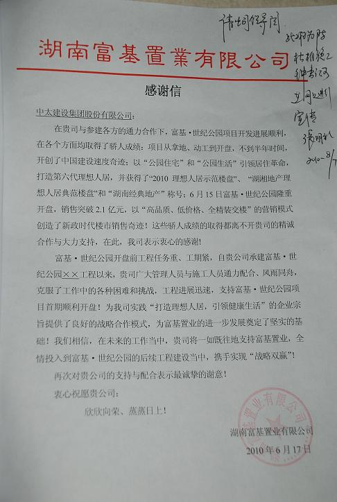近日,湖南富基置業(yè)公司給集團總部發(fā)來感謝信,稱贊集團北京第三分公司在承建“富基.世紀公園項目中,在開盤前工程任務重、工期緊的情況下,廣大管理人員與施工人員通力配合,克服各種困難和挑戰(zhàn),圓滿完成了項目建設任務,支持富基、世紀公園項目首期順利開盤。