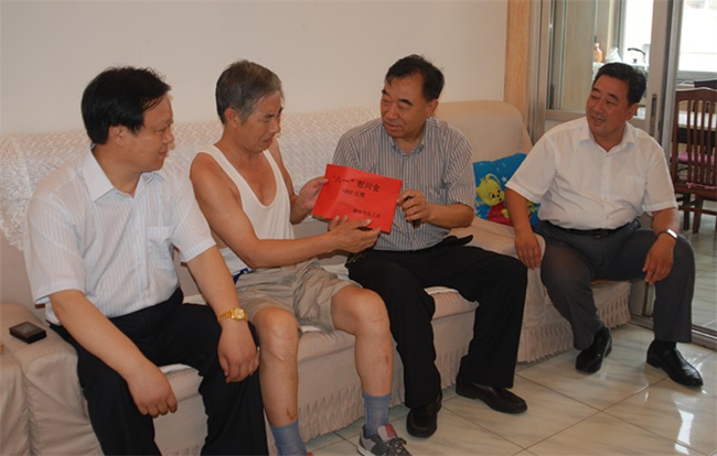 在八一建軍節(jié)到臨之際,7月27日上午,廊坊市人大副主任、市總工會主席王瑞峰(右二)、廊坊市總工會黨組書記、常務(wù)副主席關(guān)景發(fā)(右一),市總工會副主席王泰山在廊坊市建設(shè)局黨委委員、系統(tǒng)工會主任王克峰等領(lǐng)導(dǎo)同志的陪同下,來到集團(tuán)公司第一生活區(qū)家屬院,看望慰問公司因病家庭困難的軍轉(zhuǎn)干部劉國清(左二),代表市總工會向劉國清表示節(jié)日慰問,并頒發(fā)了慰問金。中太建設(shè)集團(tuán)黨委書記、董事局主席李文。ㄗ笠唬┡阃繂枴 |