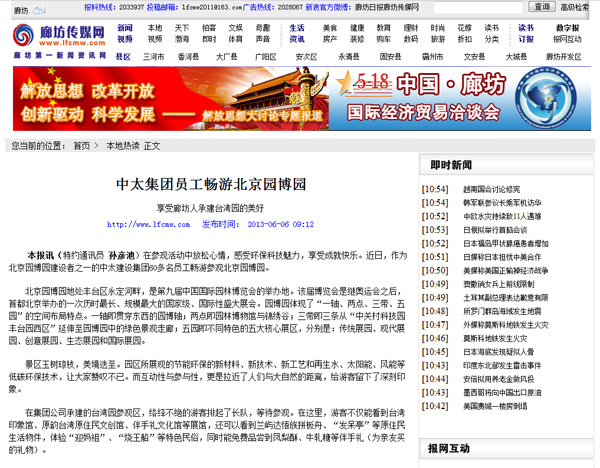 廊坊傳媒網報道了中太集團員工暢游北京園博園