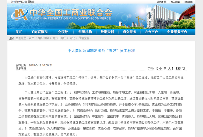 全國工商聯網站8月19日報道了中太建設集團制定出臺“五好”員工標準