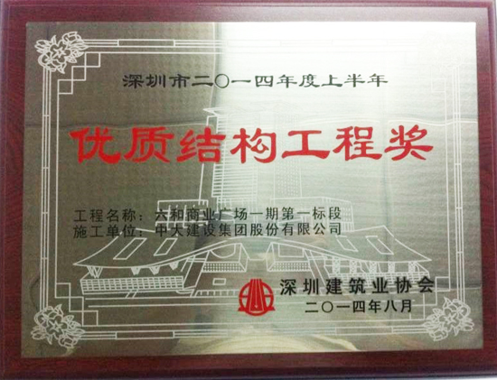 8月28日,深圳建筑業(yè)協(xié)會發(fā)布“關(guān)于表彰2014年度上半年深圳市優(yōu)質(zhì)結(jié)構(gòu)工程獎的決定”公告。第二工程局承建的房建項目“六和商業(yè)廣場一期第一標段”榮獲深圳市2014年度上半年優(yōu)質(zhì)結(jié)構(gòu)工程獎。