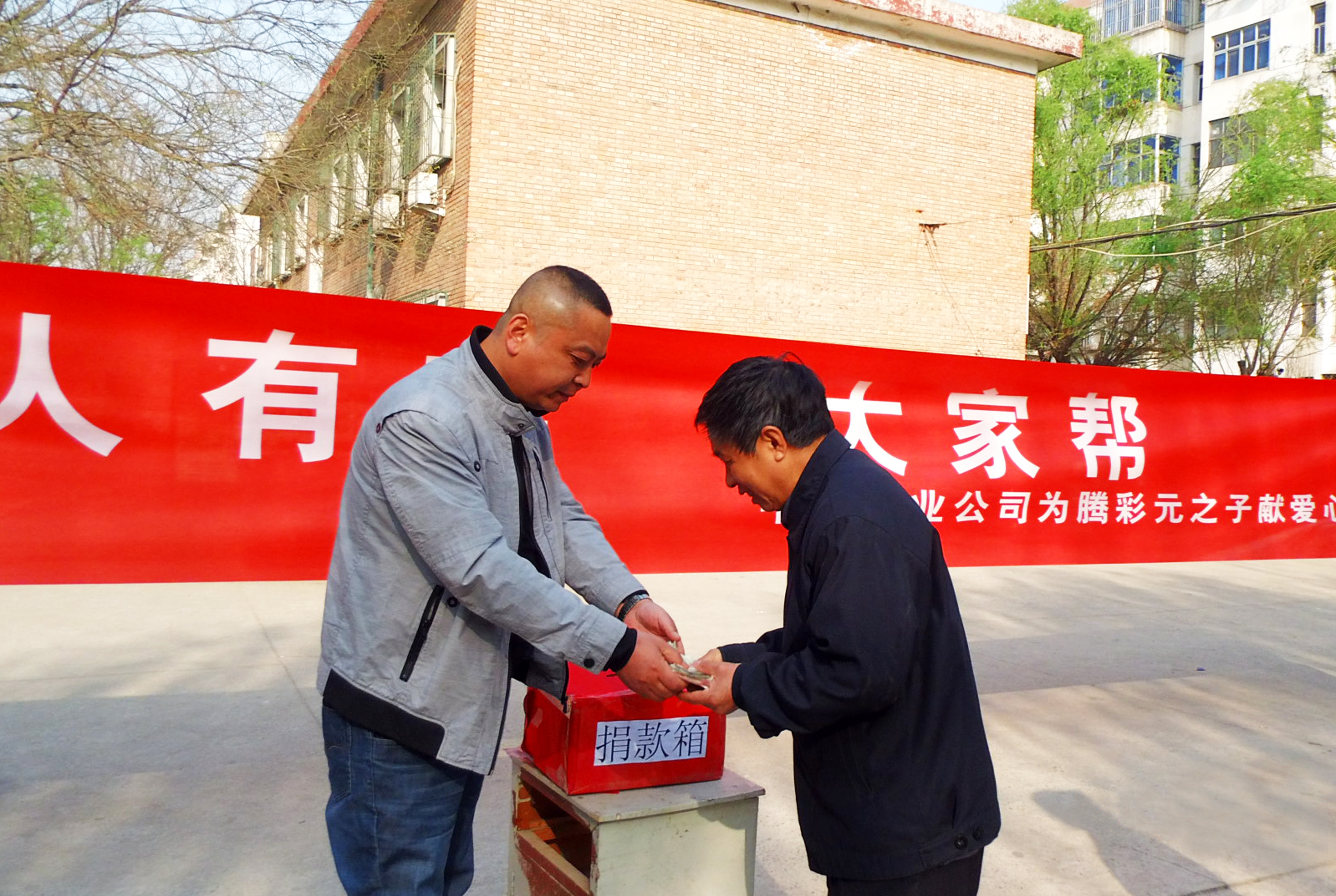 倡議一經(jīng)發(fā)出,廣大員工積極響應(yīng)、踴躍捐助,一時(shí)間,中太集團(tuán)公司內(nèi)部形成了一片“愛的海洋”。每位同事們都慷慨解囊盡力支持,500、300、200、100、50……雖然不多,但是每個(gè)人都用自己的實(shí)際行動(dòng),默默地向騰彩元一家表達(dá)著祝福與關(guān)切。因?yàn)轵v彩元早已退休,所以公司現(xiàn)在的很多員工并不認(rèn)識他本人,但愛心沒有界限,同事們并不在意。他們說,雖然沒見過其本人,但他和我們有一個(gè)共同的稱號“中太人”,同胞有難,我們理應(yīng)攜手共渡難關(guān)。中太集團(tuán)物業(yè)公司更是專門在小區(qū)里舉行了一場“為特困職工騰彩元捐款”的愛心募捐活動(dòng),大大的紅色條幅和身著工作服的保安、保潔人員分外引人注目,大家自覺排隊(duì)按順序走到捐款箱前一一獻(xiàn)出了自己的愛心。更有正在上崗的保安、保潔人員得知消息后,一到換崗時(shí)間馬上就趕到了捐助現(xiàn)場,掏出身上有零有整的錢盡數(shù)投到了捐款箱內(nèi)……在募捐現(xiàn)場,共集得善款4738元。雖然錢數(shù)不多,但是收入相對微薄的他們,并沒有吝嗇他們的大愛,“這百八十的對咱們來說算不了什么,但是人家還等著救命呢!”、“多少都是一點(diǎn)心意,幫幫這家人吧,太不容易了!”、“誰還能不趕上點(diǎn)事,能幫大伙兒就幫幫吧!”……他們的行動(dòng)感染著小區(qū)里的群眾,許多素不相識的人們在了解情況后也都紛紛伸出了援助之手,一時(shí)間,小區(qū)里洋溢著濃濃的愛的氛圍。六公司、鋼結(jié)構(gòu)、三河分公司、十一局等單位也在第一時(shí)間響應(yīng)了集團(tuán)公司的倡議,紛紛慷慨解囊,截止到4月16日,集團(tuán)上下已捐得愛心款66290元,交到了騰彩元手里,給4月17日就要進(jìn)行手術(shù)的騰彩元一家,解了燃眉之急。