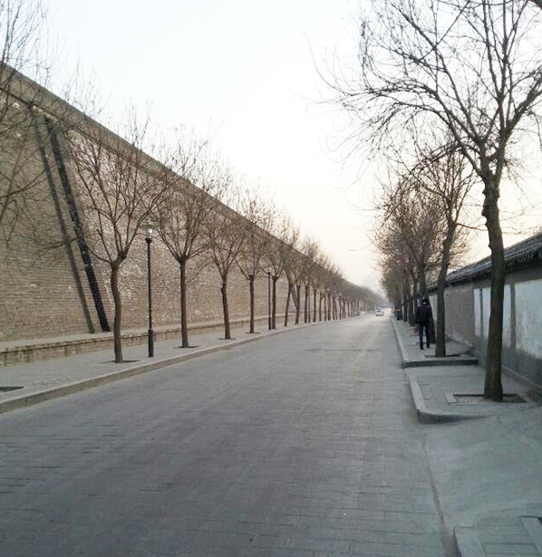 又行駛了半小時后到達了西安北站,出站后坐上去酒店的大巴,看著西安北站以及沿途的建筑,還是讓我體會到了一些古城的味道,雖然是新式建筑,但是色彩上卻都是灰色,我和同事猜測著可能是市政規劃要求的吧!隨著車子接近目的地,我們來到了古代長安城里,在進城的剎那,我們看到了高大的古城墻,導游告訴我們是這就是古代的長安城,整個長安城有這古城墻圍繞著,城墻外是護城河......這時我只被這長長的高大城墻震住了,導游的話已經聽不見,眼看著大巴已經進入城里,城墻也被遠遠的甩在了后邊,還好沒過多久我們到了酒店。放下東西,吃過晚飯,和同事三五成群又走回了城墻根下,總是想著近距離接觸一下這令人震撼的墻體,“秋風吹渭水,落葉下長安。三千繁華已流盡,斜陽斜照古城墻”,想起這詩,無限的蒼涼感頓時油然而生。雖然此時不是秋天,也沒有斜陽,但是在這陰冷寂寥的冬日里,越發顯得沉重!