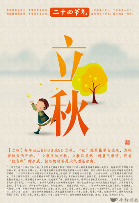 今天是立秋,意味著夏季的結束,秋季的開始,氣溫逐漸下降,雨水逐漸減少。我國幅員遼闊,就節(jié)氣而言不可能同時進入涼爽的秋季的,是有一些差別的。生活在廊坊這個地方,四季分明的氣候,是老天恩賜的福分。不冷不熱的天,氣候宜人,真正是秋高氣爽。我國古代將秋季劃分為三候:一候涼風至,二候白露生,三候寒蟬鳴。是說立秋后刮風人們會感到?jīng)鏊蟮卦绯繒徐F氣產(chǎn)生,并且秋天感陰而鳴的寒蟬也開始鳴叫。民間流行“貼秋膘”,就是在立秋這天吃些美味佳肴,老百姓家就是燉肉、包餃子。